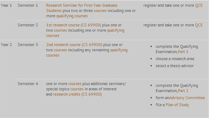 5.学习计划:学习计划必须由咨询委员会和研究生委员会批准并于资格考试后提交存档。完成至少9个课程,其中6个属于CS课程,必须包括CS 50300 -操作系统和CS 58000-理论两门课程,四门课程是QCEs考试的课程,另外三门由学生委员会和研究生咨询委员会推荐学习;学习计划GPA至少3.5;课程成绩最低为B-,若成绩低于C-时要重修该课程,要求至少完成90 个学时。